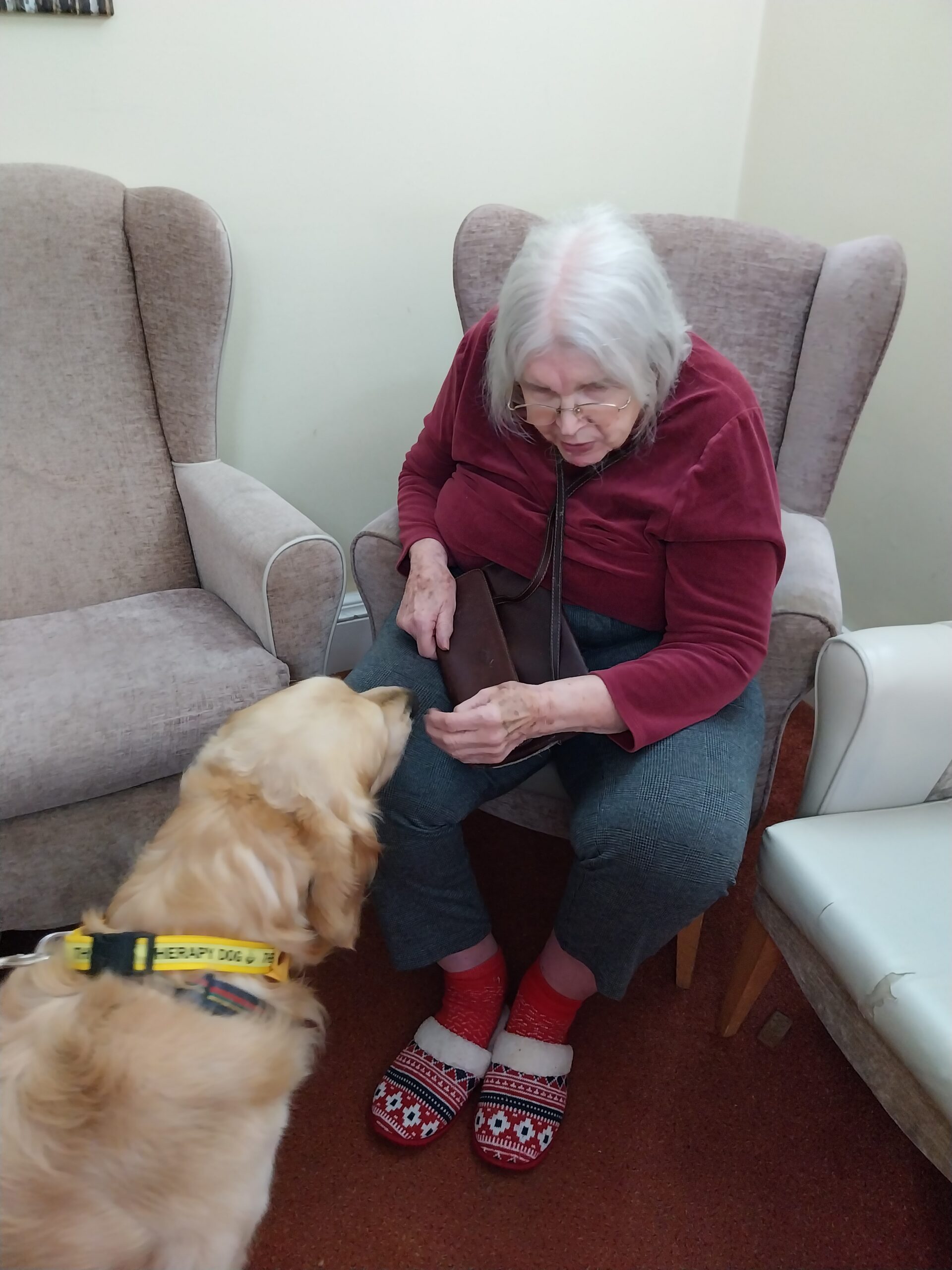 Bimble the therapy dog popped in to say hello again at The Manor, and it didn’t take long for smiles to spread around the home. 🐾